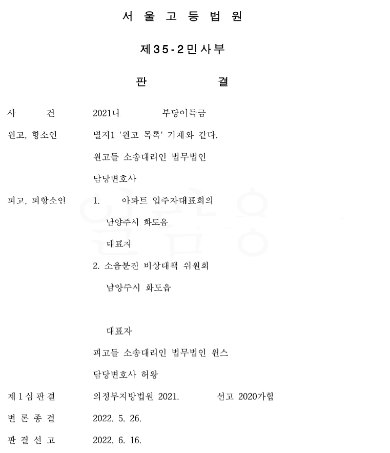 입주자대표회의 소음분진비상대책위원회 항소심 승소 – 허왕 변호사